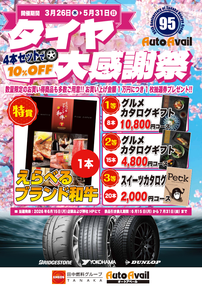 3月26日(木)より、田中燃料グループ各店にてタイヤ大感謝祭を開催しています! タイヤ4本セットで10%OFF! 期間中、タイヤお買い上げ金額10,000円につき抽選券を1枚プレゼントいたします! 【特賞】えらべるブラン …