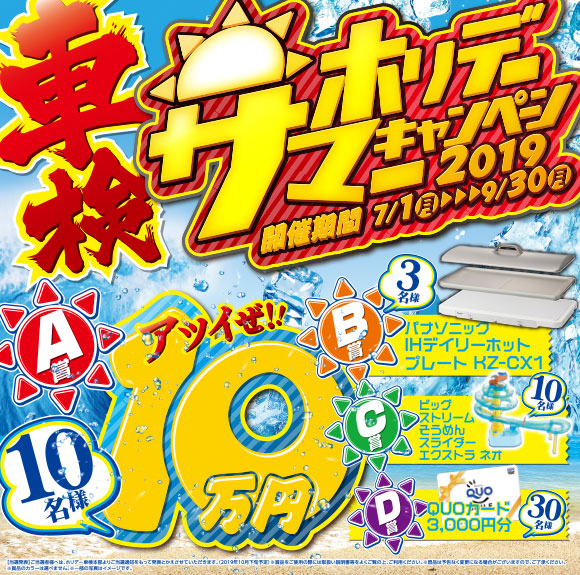 期間中にホリデー車検を受けて頂き、応募用紙をご記入いただいたお客様の中から抽選でA賞 現金10万円を10名様、B賞 パナソニック IHデイリーホットプレート KZ-CX1を3名様、C賞 ビッグストリームそうめんスライダー エクストラ ネオを10名様、D賞 QUOカード3,000円分を30名様にプレゼント!